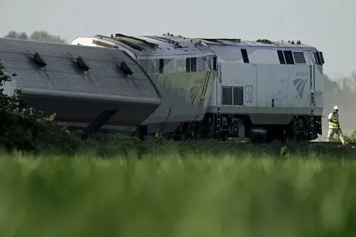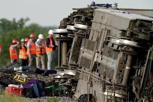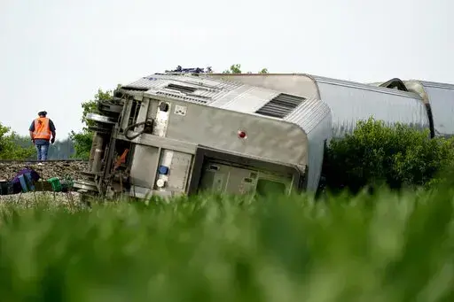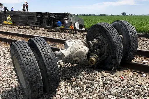 MENDON, Mo. (AP) — An Amtrak passenger train traveling from Los Angeles to Chicago struck a dump truck Monday in a remote area of Missouri, killing three people and injuring dozens more as rail cars tumbled off the tracks and landed on their sides, officials said.