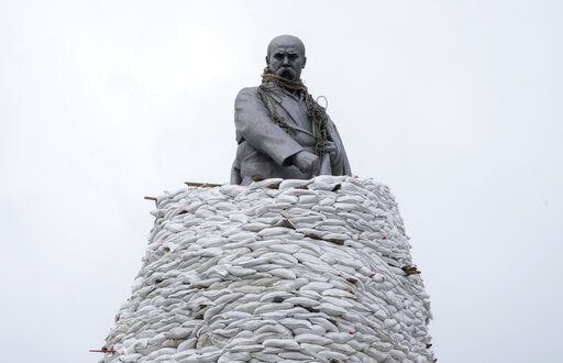 A 16-meter-high bronze monument to Taras Shevchenko, a national hero in Ukraine, survived World War II. Ukrainians have shielded it with countless layers of sandbags in hopes it also will survive Russian attacks.