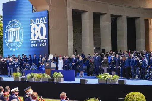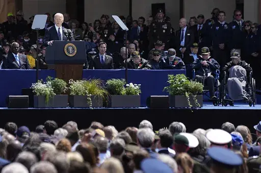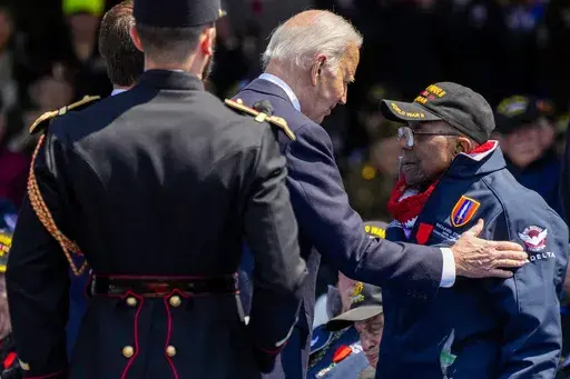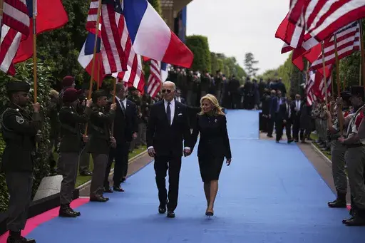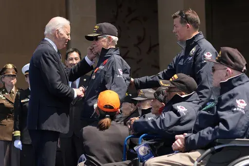 Before the ceremony, Biden and first lady Jill Biden met with more than two dozen American veterans near Omaha Beach, where the fiercest D-Day fighting took place. Those who could stand were helped out of wheelchairs to pose for photos. Most shook hands with Biden or saluted; one hugged him.