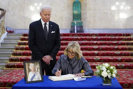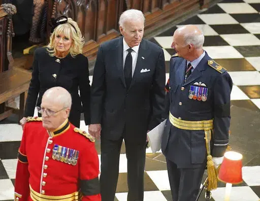 The president and first lady were among some 2,000 people attending the funeral at Westminster Abbey. The couple arrived for the funeral, waiting in the back as a procession moved past, before taking their seats among hundreds of others. They arrived in London late Saturday and paid respects to the queen on Sunday, viewing her coffin at Westminster Hall, signing condolence books at Lancaster House and attending a Buckingham Palace reception for funeral guests hosted by King Charles III.