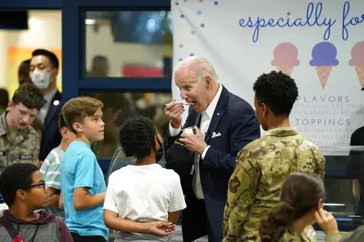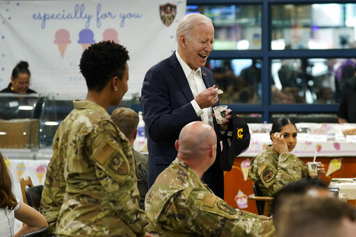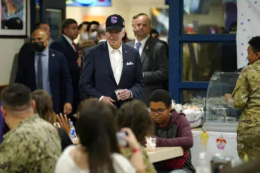 While on base, Biden chatted with the troops and their families at the bowling alley and indulged his passion for ice cream — twice over. First chocolate chip, then vanilla and chocolate.