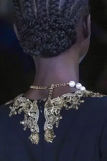 Some of the most gasp-worthy looks were inspired by Empress Elisabeth of Austria, recently given a modern edge in the film “Corsage.” One model wore a chunky pearl necklace with a buttoned-down black silk full-length dress featuring gold embroidery. Another look featured a square-necked Cinderella dress in lilac satin with a peek of black tulle and matching lilac pumps.