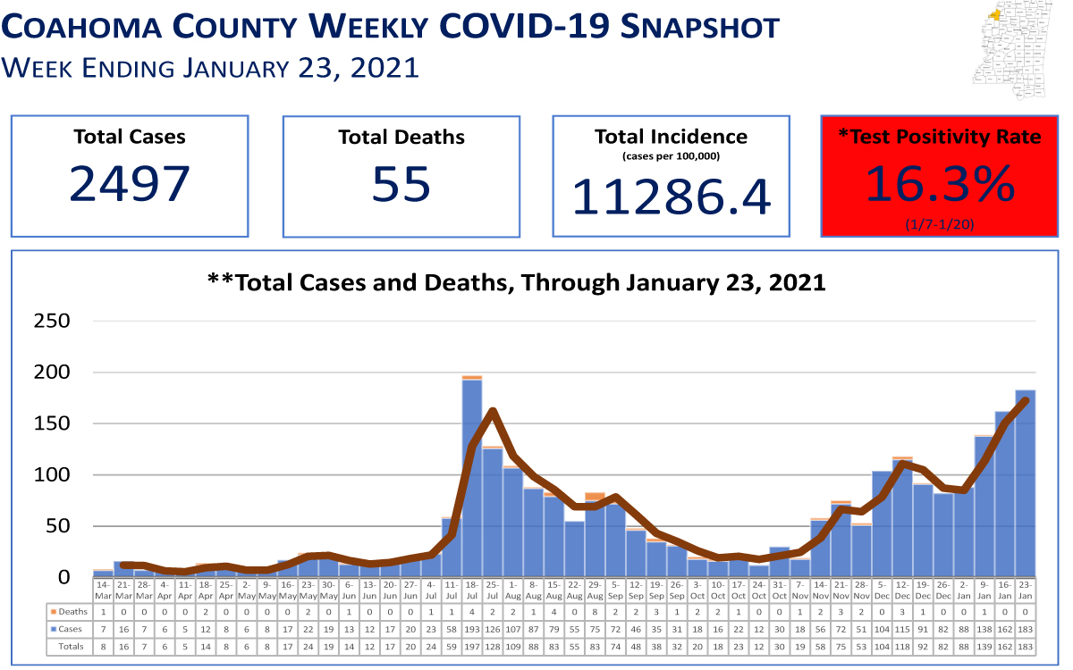 MSDH reported this week that two deaths had been reported in Coahoma County based on data taken from official death certificates since Dec. 14, 2020. A second one was recently recorded the week of Jan. 3-9.