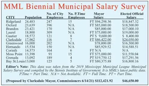 The annual compensation for Mayor went from $86,421 to $122,421.92, an increase of $36,000.92. The annual compensation for a Clarksdale Commissioner went from $26,650 to $46,650, an increase of $20,000.