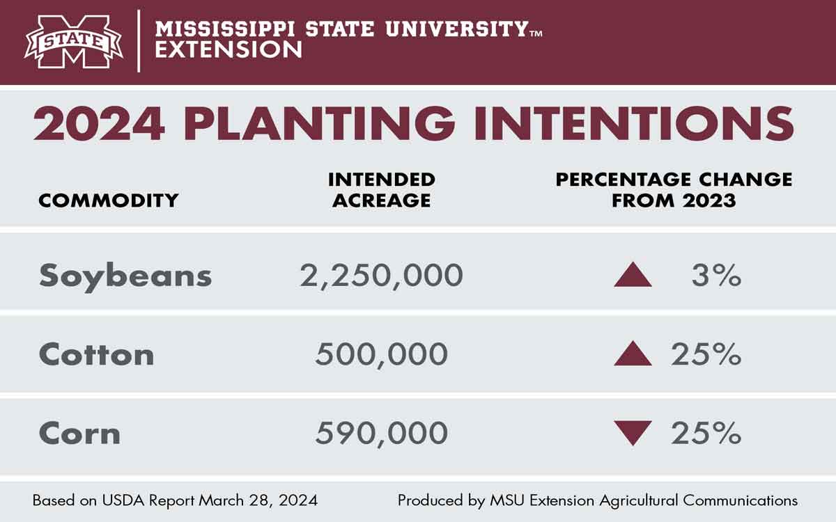 Producers surveyed in Mississippi expect to plant 2.25 million acres of soybeans this year, which would be a 3% increase.