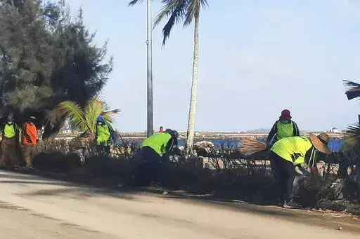 Coastlines are strewn with debris, while people work to clean streets and walkways.
