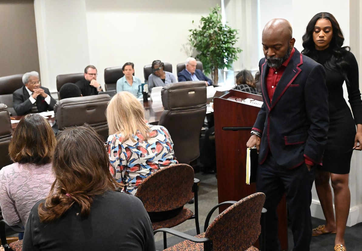 Terris Harris, attorney representing Taste Bar and Grill owners Clifton and Latrice Rodgers, with Latrice Rodgers at a Jackson Planning Board meeting, Wednesday, Oct. 22, 2025, in Jackson. Credit: Vickie D. King/Mississippi Today