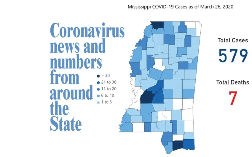 As of Friday, seven deaths had been reported in the state and 579 cases confirmed by the CDC and the MSDH. Mississippi has a population of 2.987 million people.