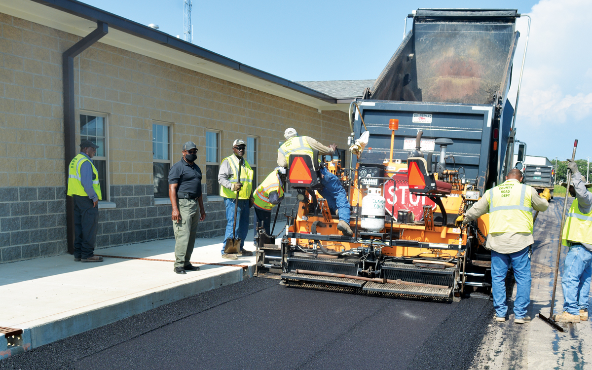 The county has repeatedly used county labor and equipment to help cut costs on the new Justice Center. Work began Monday on the last overlay of the parking lot and subsequent striping.