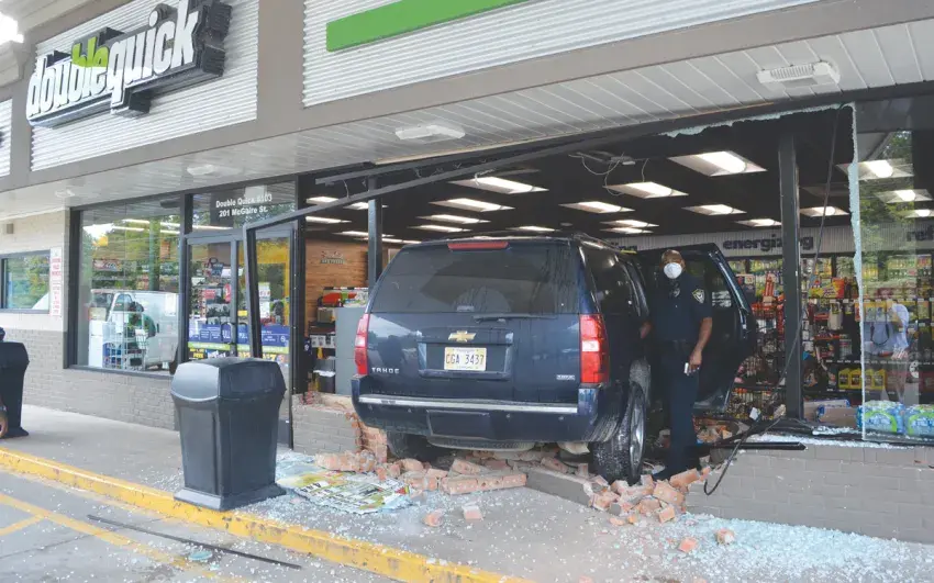 A Chevrolet Tahoe jumped the curb, crashed through bricks and a plate glass window and rolled into the first row of shelves at the Double Quick at 201 McGuire Cove about 1 p.m. Friday.