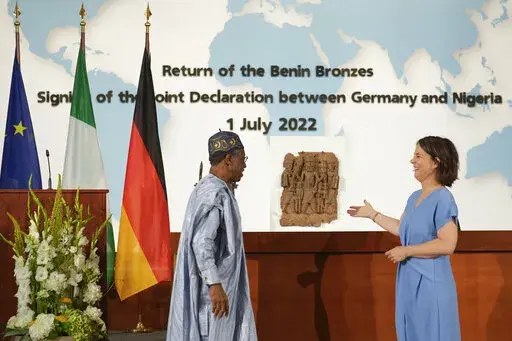 BERLIN (AP) — Germany and Nigeria on Friday signed an agreement paving the way for the return of hundreds of artifacts known as the Benin Bronzes that were taken from Africa more than 120 years ago — an accord that Nigerian officials hope will prompt other countries to follow suit.