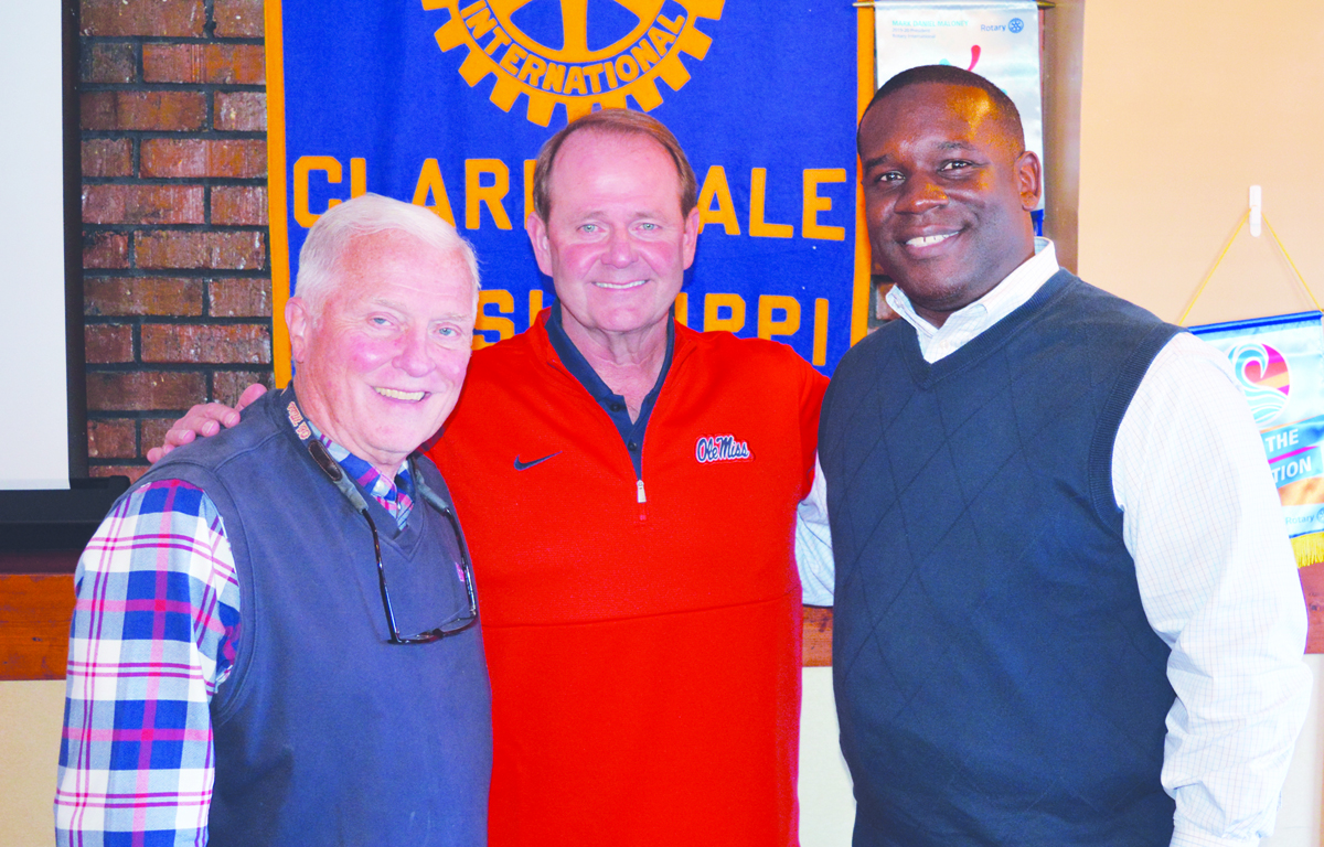 Clarksdale Rotary Club welcomed Ole Miss Basketball Coach Kermit Davis to town at noon Tuesday, Oct. 22. Davis, center, was the guest of Ed Peacock, left, and Rotary President Sanford Johnson.