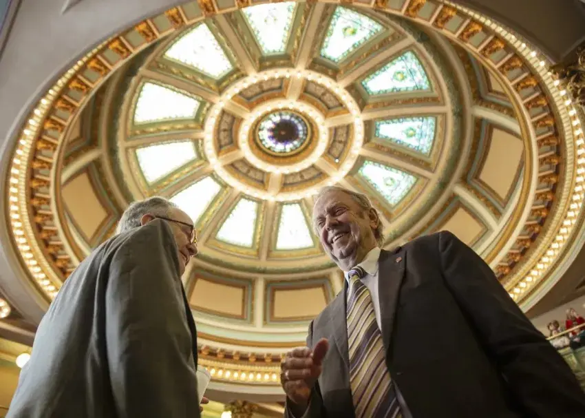 Sen. Buck Clarke, R-Hollandale and Senate Appropriations chairman, left, shares a laugh with Mississippi Commissioner of Insurance Mike Chaney during the 2019 legislative session in Jackson Wednesday, January 9, 2019. Credit: Eric J. Shelton, Mississippi Today/Report For America