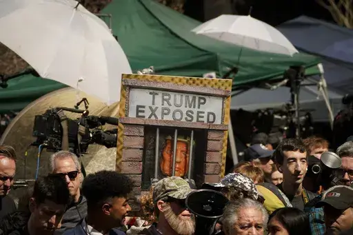 A crowd of Trump supporters, thronged by journalists, gathered Tuesday outside the Manhattan courthouse. Republican Reps. Marjorie Taylor Greene of Georgia and George Santos of New York, who is facing multiple investigations over lies he told while running for office, were swarmed by cameras and reporters when they arrived and spoke mid-morning. A band of anti-Trump protesters appeared with a large banner saying, “Trump Lies All the Time.”