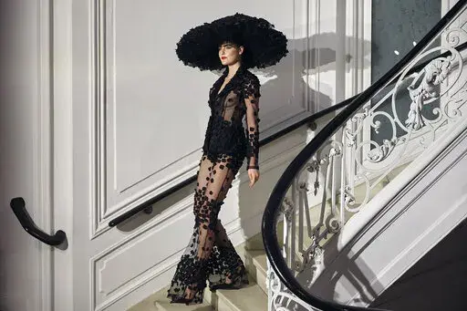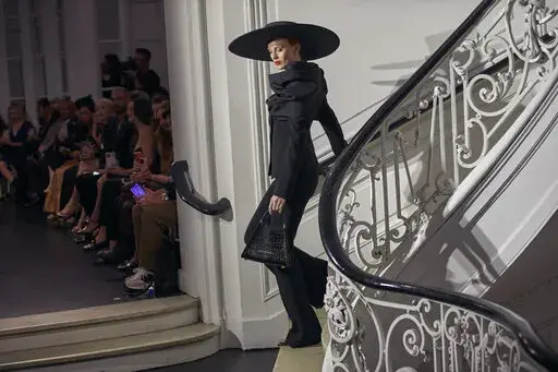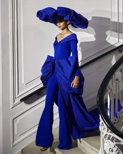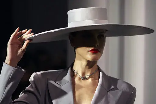 Ultra-wide brim hats stole the show in black, royal blue and bright red. There was plenty of sparkle, and an asymmetrical set of huge tiered ruffle bell sleeves on one high-neck evening dress in white. One sleeve started at the shoulder and the other at the elbow.