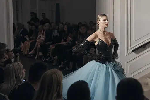 Among his trademark show stoppers was a gown of baby blue for the skirt paired with a sparkly black spaghetti-strap top with a cinched waist and long black gloves to match. A riot of ruffles adorned a long-sleeve gold gown and he put narrow stripes in gold and black on another.