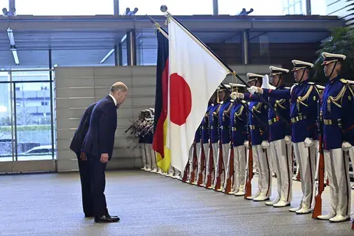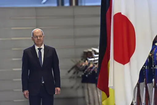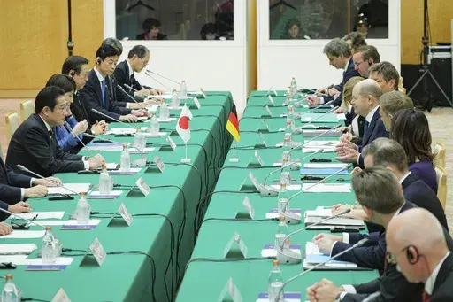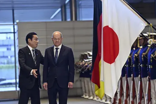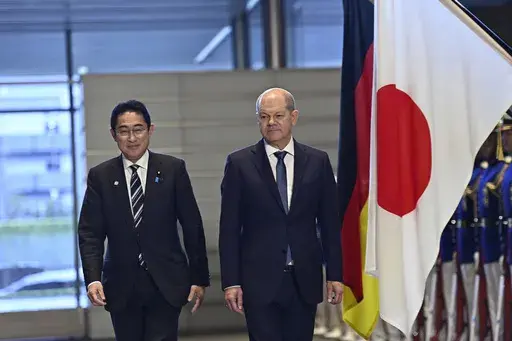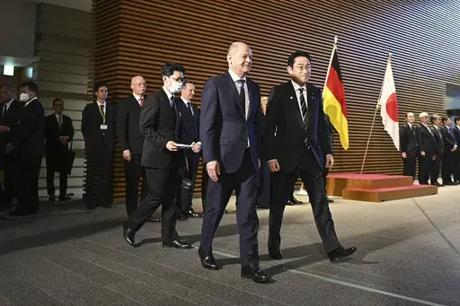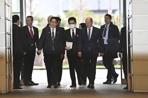TOKYO (AP) — German Chancellor Olaf Scholz and Japanese Prime Minister Fumio Kishida on Saturday held the first round of government consultations in Tokyo and agreed to strengthen economic and defense ties to better cope with China's growing influence and global security concerns.