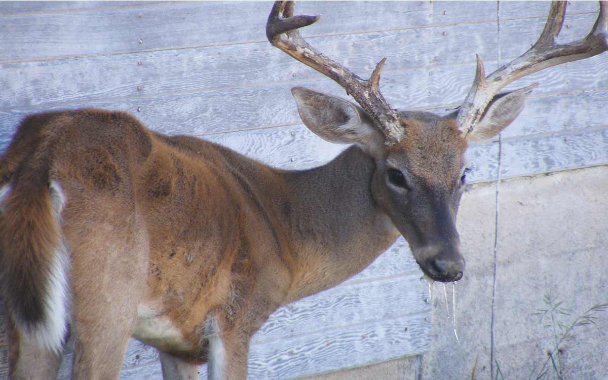 Chronic wasting disease, or CWD, is a prion disease that is easily transmissible to deer through saliva, feces, urine or a contaminated environment. The amount of positive material needed to infect deer 100-percent of the time is the size of one very fine grain of sand. Conditions are ripe for CWD’s spread when an infected deer congregates with other deer in a small area, such as around a salt lick or feeder.