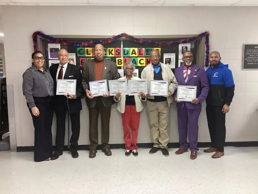 Leaders are recognized for Black History Month. Pictured from left are Clarksdale Municipal School District Superintendent Dr. Toya Harrell-Matthews, Henry Espy, Andrew Thompson, Dr. Peggy Johnson Wells Howard, Donell Harrell, Greg Hoskins, and Principal Shun Readus.
