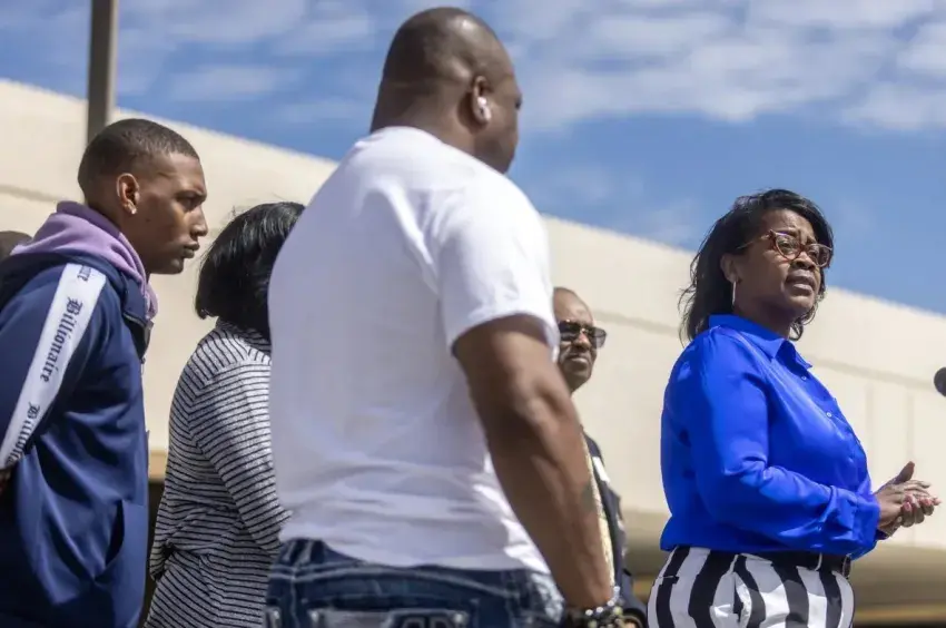 Danyelle Holmes, of the Mississippi Poor People’s Campaign, center, speaks during a Mississippi Rapid Response Coalition press conference about Jackson’s water issues at the Mississippi E-Center at Jackson State University in Jackson, Miss., Wednesday, March 22, 2023. Credit: Eric Shelton/Mississippi Today