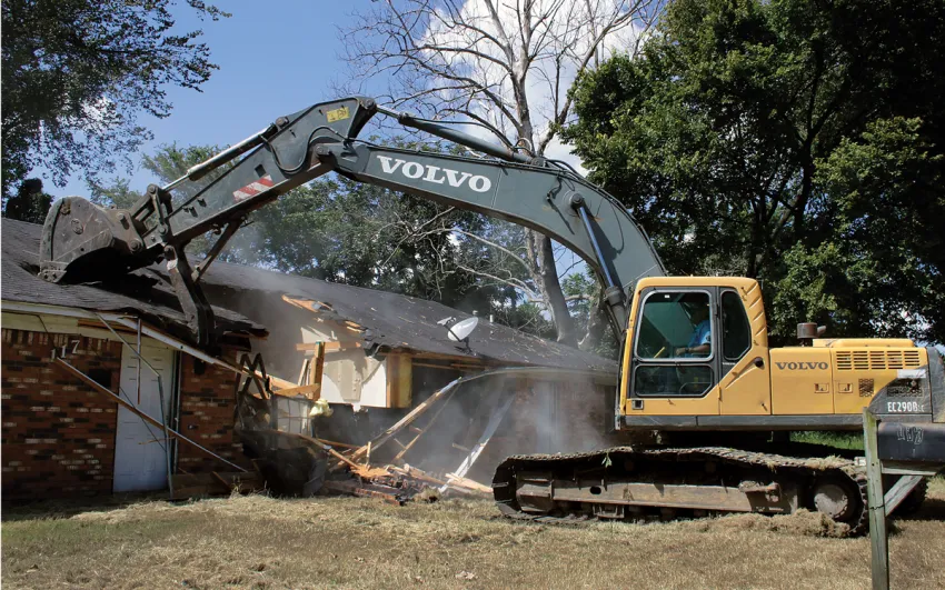 A powershovel digs into a house deemed a public menance by the City of Clarksdale.