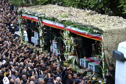 A procession Tuesday morning led by a semitruck carrying the caskets of the dead slowly moved through the narrow streets of downtown Tabriz, the closest major city near the site of the crash Sunday. Thousands in black slowly walked beside the coffins, some throwing flowers up to them as an emcee wept through a loudspeaker for men he described as martyrs. On Wednesday, a funeral presided over by Khamenei will turn into a procession as well.