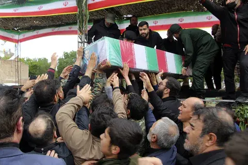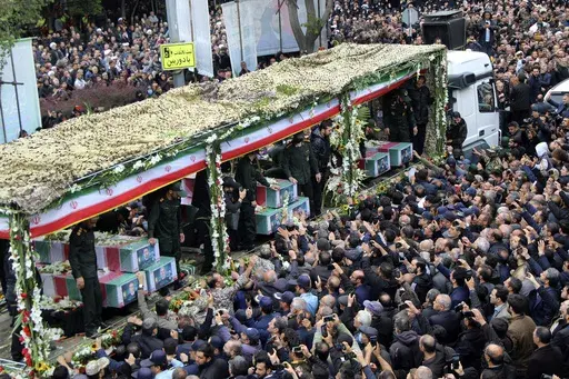 The caskets later arrived in Tehran to an honor guard at the airport and then went onward to the holy Shiite seminary city of Qom. There, a semitruck surrounded by soldiers in fatigues at one point was swarmed by a crowd of mourners. Some beat their chests and wailed. The truck later picked up speed while others stood alongside the road, watching.
