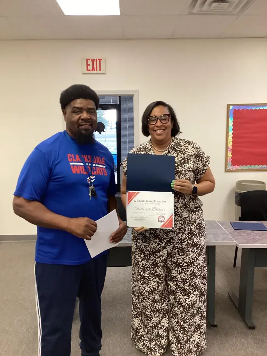 Superintendent Dr. Toya Harrell-Matthews, right, recognizes Coach Fredrick Brister for taking on extra duties in the cafeteria in addition to his regular job. Brister went above and beyond the call of duty. The presentation was made at the Sept. 18 Clarksdale Municipal School District board meeting.