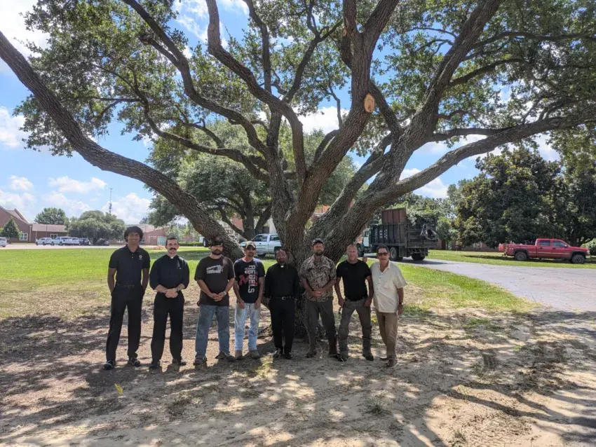 This is a group picture of people charged with the beautification project at the St. Elizabeth Catholic Church and School campus. They are Father Raju Macheria (directing), Ronnie Demilio (coordinating), seminarians Will Foggo and Francisco Maldonado (assisting as needed), the company hired to focus on the 21 live oak trees Russell Tree Service with brothers John, Matt, Jason, and Matthew Russell II.