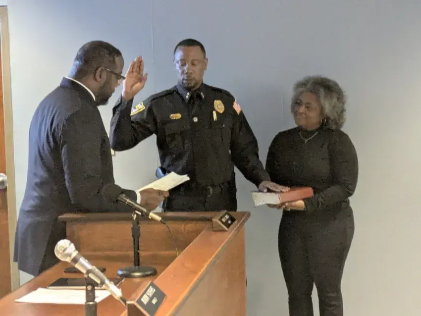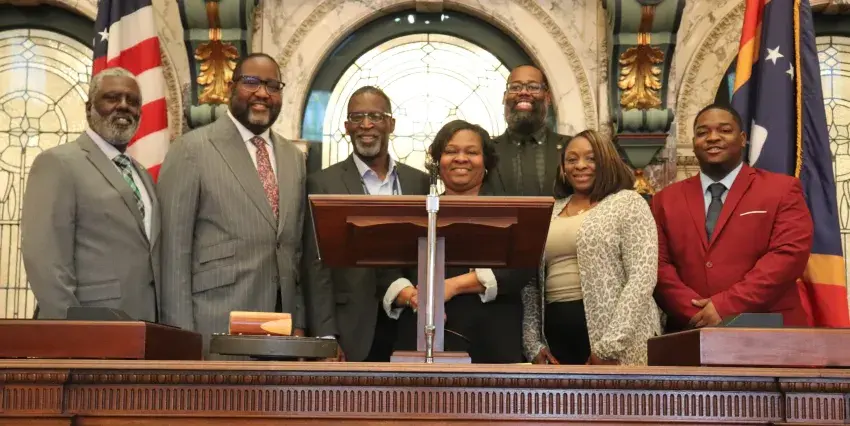 District 11 Sen. Reginald Jackson, in back row, visited on Wednesday, Jan. 14, with local and state officials representing areas of Coahoma County. They all came together at the State Capitol. In front, from left, are District 26 Rep. Otha Williams, Clarksdale Mayor Orlando Paden, Clarksdale Ward 1 Commissioner Ray Sykes, Jonestown Alderman Subrenia Johnson, Jonestown Alderman Lashasa Griffin, and Jonestown Mayor Columbus Russell Jr.