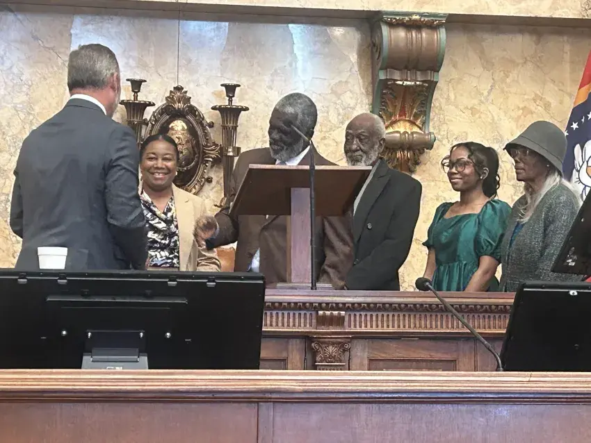 Otha E. Williams III, third from left, is sworn in as the District 26 State Rep. at the State Capitol in Jackson on Wednesday. Speaker Jason White, left, swears Williams in. Pictured from left are White; Williams’ wife Ann, who is the Coahoma County Tax Assessor/Tax Collector; Williams; Williams’ father Dr. Otha E. Williams Jr.; Williams’ daughter Alayna Williams; and Williams’ mother Claudet W. Williams.