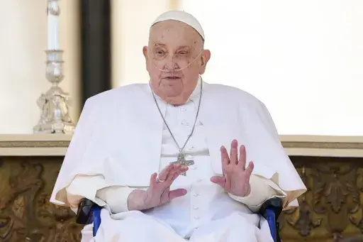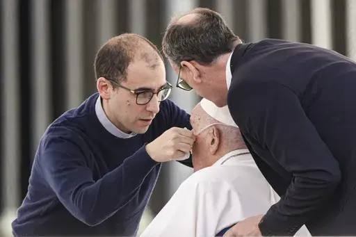 He wore nasal tubes to receive supplemental oxygen, which the Vatican says is being gradually reduced. As he waved and blessed the crowd, his arm movements remained limited — which his doctor said was not related to his illness but to an unspecified trauma suffered before his Feb. 14 hospitalization.