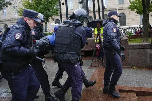 In Moscow, a heavy contingent of police roamed a downtown area where a protest was planned under pouring rain and checked the IDs of passersby. Officers rounded up those they deemed suspicious and later distributed call-up summons to the men who were arrested.