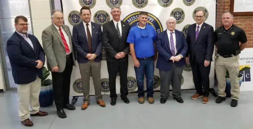 State and local dignitaries joined the MDOC leadership in announcing the opening of a new transitional work center. They included, from left, Pearl Mayor Jake Windham, State Rep. Gene Newman, Dep. Commissioner Bradley Lum, Brandon Mayor Butch Lee, Russell Fitzhugh, Commissioner Burl Cain, Sen. Dean Kirby, and Rankin Sheriff Bryan Bailey.