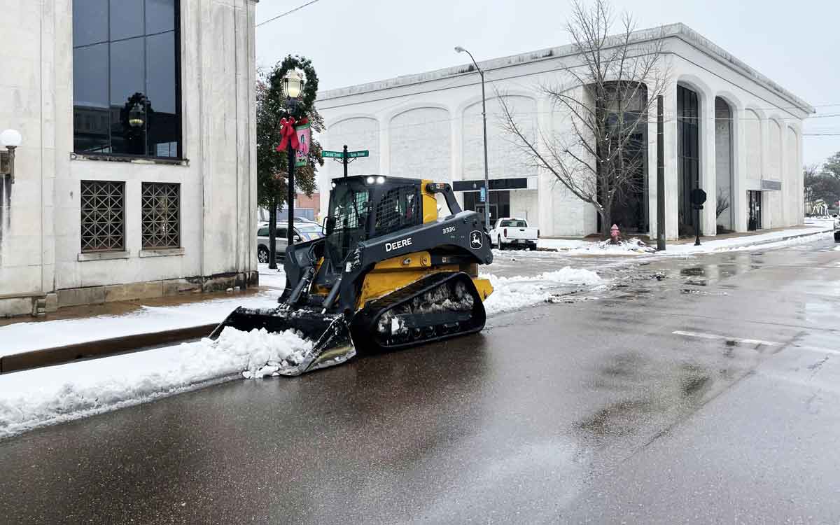 The City of Clarksdale has snow plows, or graders, front-end loaders and bobcats out scraping streets as the snow fell and most main streets in town were clear by 10 a.m.