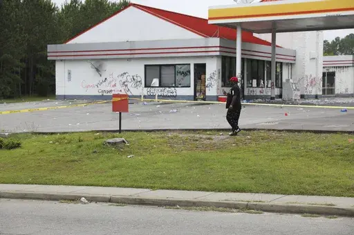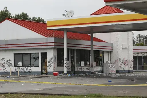 The entire gas station was behind yellow crime scene tape Tuesday morning. Dozens of crushed water bottles littered the parking lot. Graffiti, most of it “Cyrus” or “14” covered the walls.