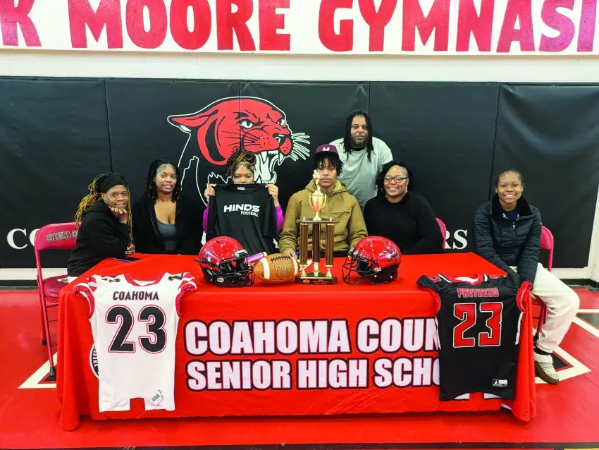 Coahoma County High School senior Zechariah Smith signs to play football for Hinds Community College. Seated from left are Smith’s aunt Wiltrinessa Grandberry, Smith’s aunt Larita Miller, Smith’s sister Zymeria Smith, Zechariah Smith, Smith’s mother Tahiti Miller, and Smith’s cousin Lajeffria Miller. Standing is Smith’s father Reginald Smith