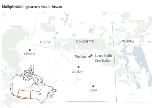 The stabbings took place in multiple locations on the James Smith Cree Nation and in the village of Weldon, northeast of Saskatoon, police said.