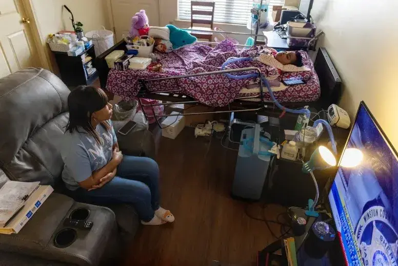 Shavondra Smalley wakes up on her living room couch and looks at her 8-year-old daughter Layla stretched out on a hospital bed beside her, BiPAP machine humming. The two start their day as they always do.