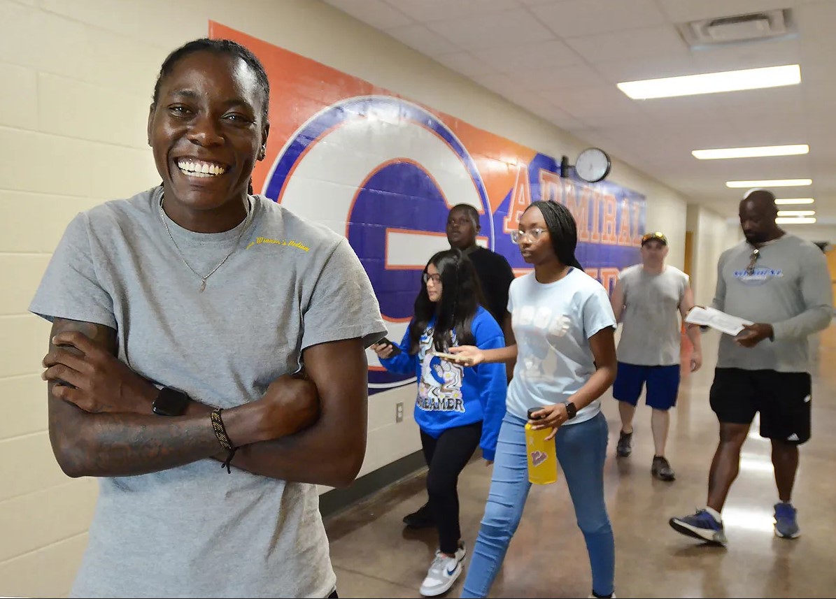 “Naturally, there was a concern about how an Olympic and world champion would react to coaching high school kids,” Walters said. “She has been extremely humble and has really connected with the kids. She’s been going to all the teams on campus and the kids have embraced it. She’s going to the junior highs and even the elementary schools.”