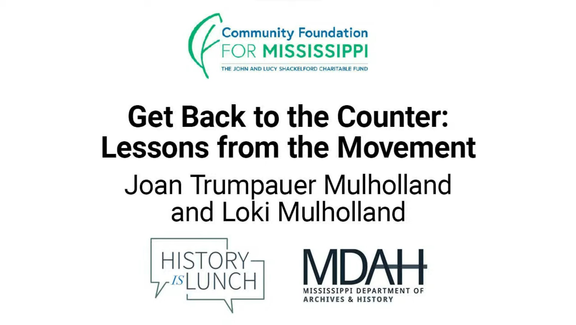 History Is Lunch is sponsored by the John and Lucy Shackelford Charitable Fund of the Community Foundation for Mississippi. The weekly lecture series of the Mississippi Department of Archives and History explores different aspects of the state's past. The hour-long programs are held in the Craig H. Neilsen Auditorium of the Museum of Mississippi History and Mississippi Civil Rights Museum building at 222 North Street in Jackson and livestreamed on YouTube and Facebook.