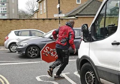 LONDON (AP) — A man suspected of stealing an artwork by Banksy of a stop sign adorned with three military drones, was arrested Saturday, London police said.
