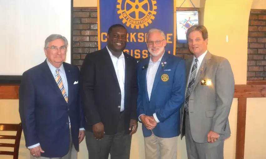 The Clarksdale Rotary Club welcomed the Governor of Rotary District 6800 Jonathan Maddox to their meeting Tuesday, Sept. 3. Shown are from left, Senior Member Joe Gibbs, Clarksdale Rotary President Sanford Johnson, Gov. Maddox and Assistant District Governor Robin Dambrino.