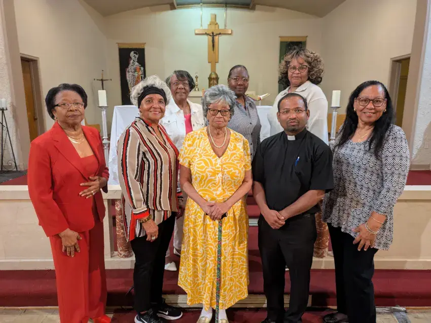 Members of Immaculate Conception Catholic Church in Clarksdale come together. From left to right in the front row are Lydia Williams, Father Raju Macherla, Mrs. Charles Zetta White, Josephine P. Rhymes and Lula Orsby Jones. Back row, from left to right, are Angela Cousin, Linda Johnson and Christine McDaniel.
