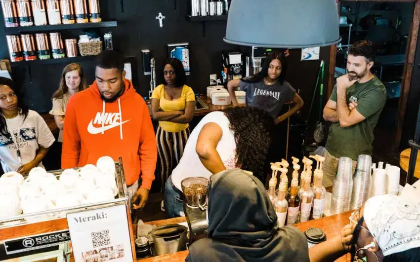 The coffee shop crowd had thinned considerably, after the morning customers moved on to start their workdays. Just inside the door sat shelves of fresh Meraki coffee, all roasted on-site. Signs trumpeted the creatively named original coffees and teas such as London Fog, Peppermint Bark Mocha and Delta Christmas Tea.