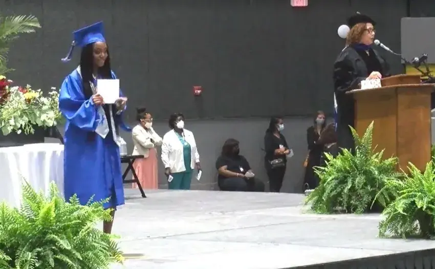 This screen grab from video provided by Jackson Public Schools shows Kennedy Hobbs, left, at her graduation June 1, 2021, from Murrah High School. Hours later, the 18-year-old was fatally shot three times at a Texaco gas station in Jackson, Miss. Courtesy of Jackson Public School District