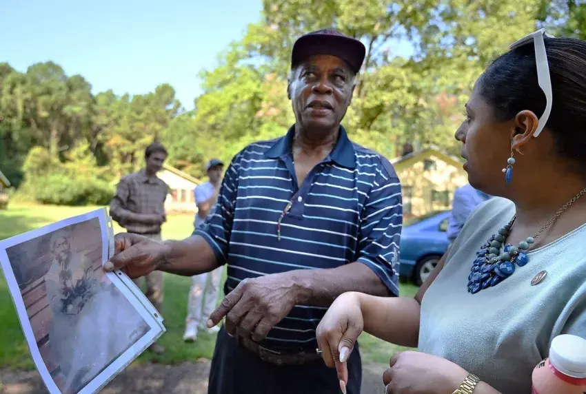 Clinton resident James Robinson shares with Rep. Zakiya Summers the tale of how his great, great, great grandmother Sally Lee (pictured) survived the Clinton Massacre in 1875, Thursday, Sept. 4, 2025, at the Mississippi Freedom Trail Marker commemorating the tragedy. The marker is located in the 300 block of Northside Drive in Clinton. Credit: Vickie D. King/Mississippi Today