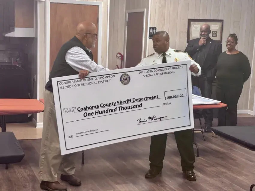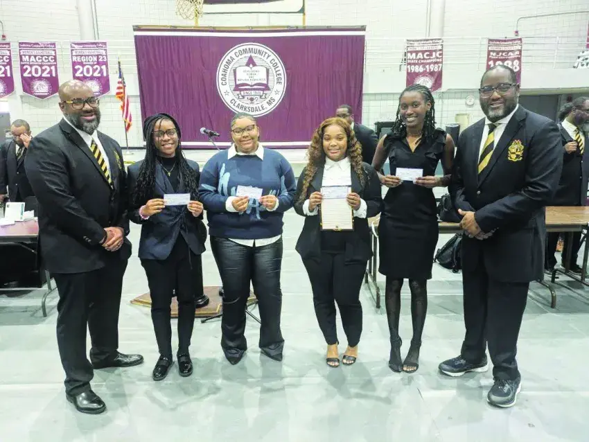 Oratorical contest winners receive their checks. Pictured from left are Alpha Phi Alpha Fraternity Inc. Epsilon Xi Lambda Chapter President Robert Williams Jr., third-place winner Myla Walker from Clarksdale High School, second-place winner Billaysia Williams from Coahoma County High School, first-place winner Denellia Coleman from Madison Shannon Palmer High School, Brianna Lance from Greenville High School and event chair Clarksdale Mayor Orlando W. Paden.