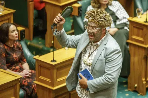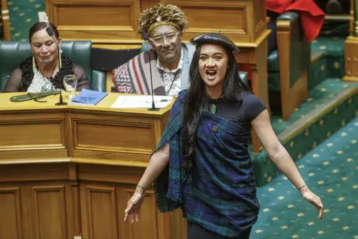 Party lawmaker Takuta Ferris wore a Maori headdress and performed a haka, a traditional dance or challenge accompanied by a chant, as he crossed the chamber to make an affirmation that confirmed his place in the Parliament.