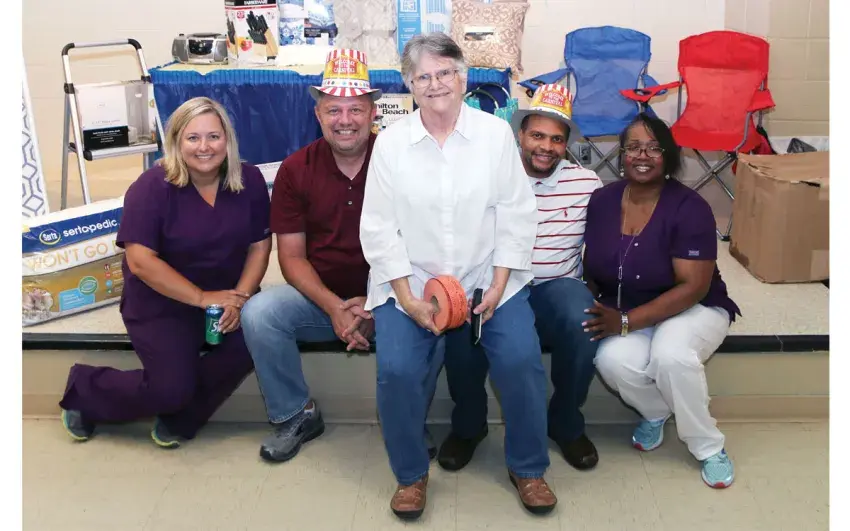 Volunteers and staff members at the Rev. S. L. A. Jones Activity Center are all smiles as they wait to give away the nice prizes in the background at a recent event at the center. Pictured are, from left, Jennifer Walton, Trey Hamby, Gertrude Vincent, Roderick Gordon and Patricia Payno.